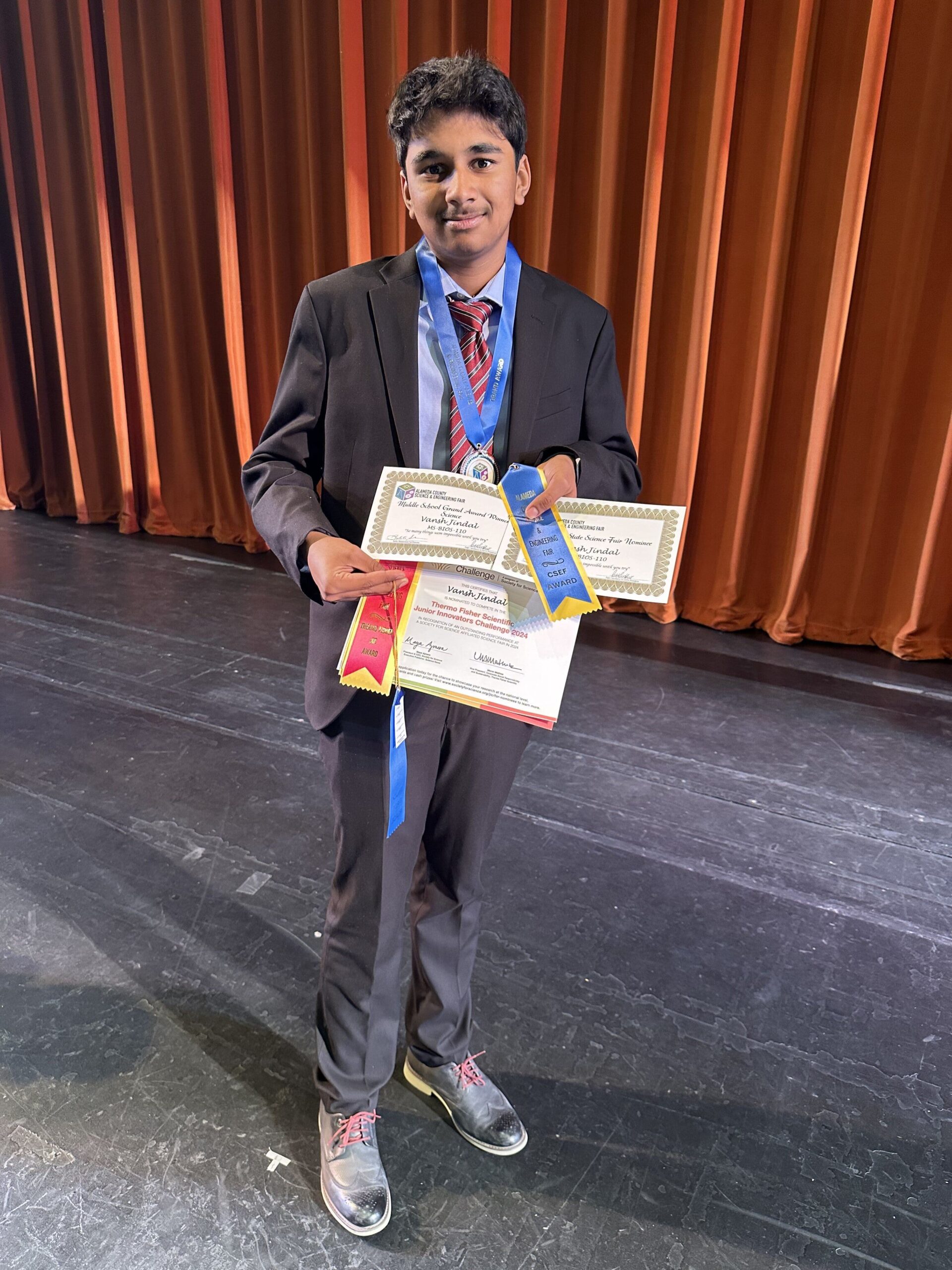 It is science fair season, and our Stratford Fremont Middle School and Stratford Pleasanton Middle School students showed their innovative prowess on Saturday, March 16, when they competed in the 2024 Alameda County Science and Engineering Fair. Our two middle schools took home a total of 46 science fair awards, including eight 1st Place Awards and Teacher of the Year! Two of our science fair winners will go on to compete at the State Fair, Vansh Jindal (8th – PLSMS) and Ayana Baul, Siri Nuvvuru, and Nadia Tsui (7th – FMS).